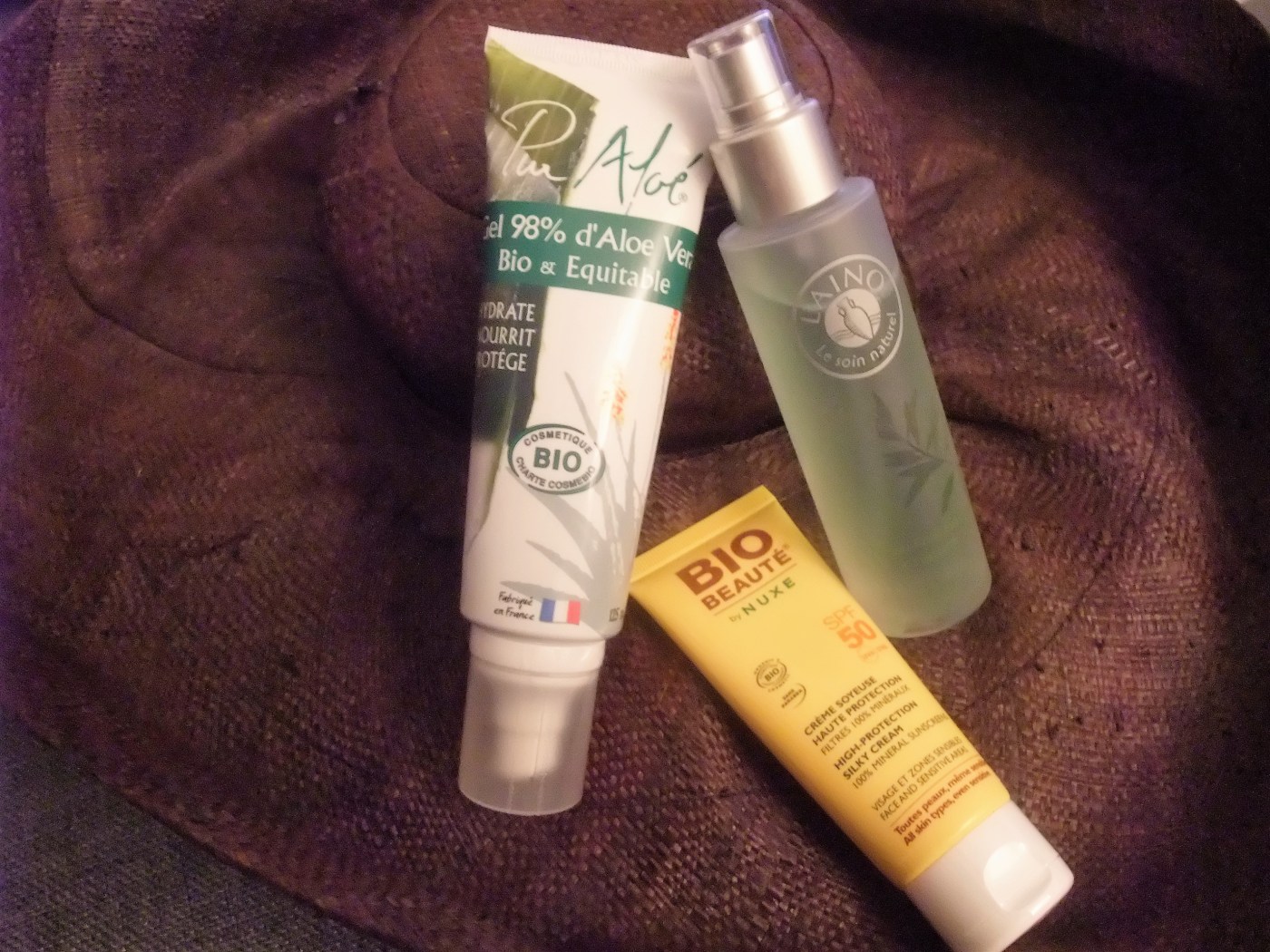 C’est le seul produit vraiment indispensable de l’été en fait, pour se protéger du soleil en toute circonstance, éviter des tas de désagréments liés aux UV. Je prends toujours une protection haute, et je me rends compte que ça n’empêche pas du tout de prendre des couleurs…Jusqu’à maintenant, je le reconnais, je n’utilisais pas de crème solaire bio ou maison, c’était une des entorses à ma routine naturelle, les produits testés ne m’avaient vraiment pas satisfaite, et j’ai tendance à être un peu stressée dès qu’on touche à la santé pure, ce n’est pas rien quand même. Mais je refais une tentative cette année, avec une crème pour le visage SPF 50, de chez Nuxe Beauté. En revenant, je vous ferai une revue détaillée de ce produit !