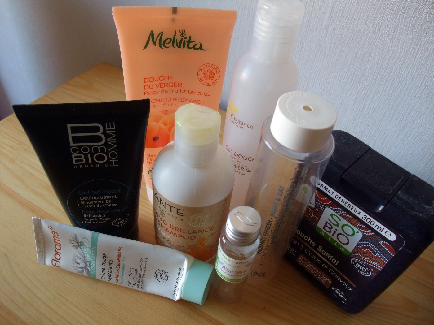 Je vous les avais annoncés, les voici, les voilà ! Mes produits finis bio du mois d’octobre ! C’est en fait la synthèse des mois d’été, j’ai fait traîner pour avoir pas mal de produits à vous montrer, c’est toujours plus sympa ! Que contient cette revue ? Trois gels douche, un shampoing, un gel pour le visage, une crème de jour, un tube d’aloe vera, une eau micellaire. Pour la première fois, je vous parle de produits masculins, ceux de mon copain, que je convertis petit à petit au bio et au naturel (et il ne s’en plaint pas trop :)).